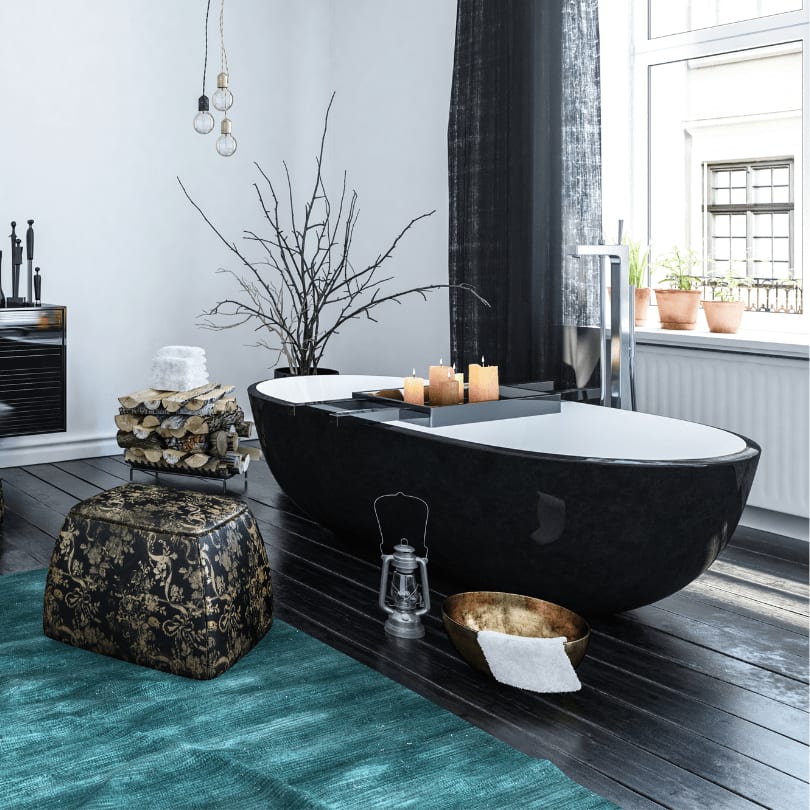 Step away from the black tub. Choose white tubs and sinks, which will always be in style.